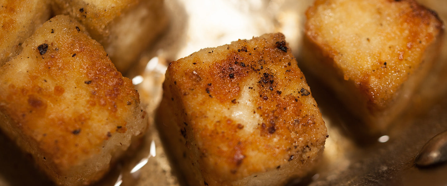 - Individually place pieces of tofu into the hot oil, leaving room to flip with tongs or a metal spatula. Fry each side, about 1 minute each, until a light golden brown. Remove from oil and set on a paper towel to drain and cool.