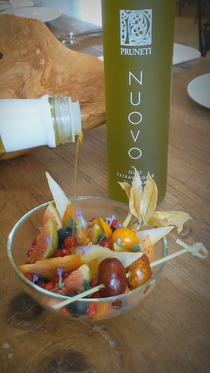 The original Nuovo from renowned Tuscan producer Frantoio Pruneti is crushed from the season's very first pickings of locally grown Frantoio, Leccino and Moraiolo olives grown in the heart of Chianti. This fresh oil is extraordinarily balanced yet robust with notes of green fruit and sweet vegetables, accompanied by pleasant notes of basil and fennel with a strong peppery finish. Excellent with freshly toasted bread, roasted root vegetables, grilled fish and meats, and hearty soups.